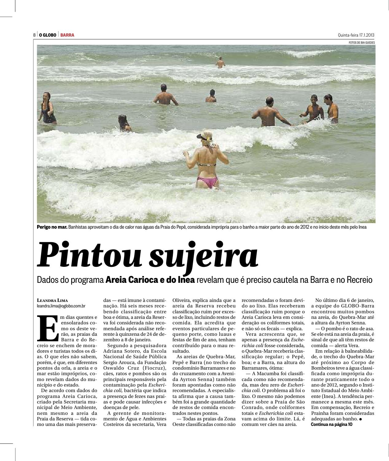 O jornal O Globo, na edição de 17 de janeiro, no caderno Barra, publicou matéria sobre o perigo de contaminação pelas areias das praias do Rio de Janeiro. Segundo a pesquisadora do Departamento de Saneamento e Saúde Ambiental (DSSA/ENSP) Adriana Sotero, citada pelo jornal, os cães, ratos e pombos são os principais responsáveis pela contaminação pela Escherichia coli, bactéria que indica a presença de fezes nas praias e pode causar infecções e doenças de pele.