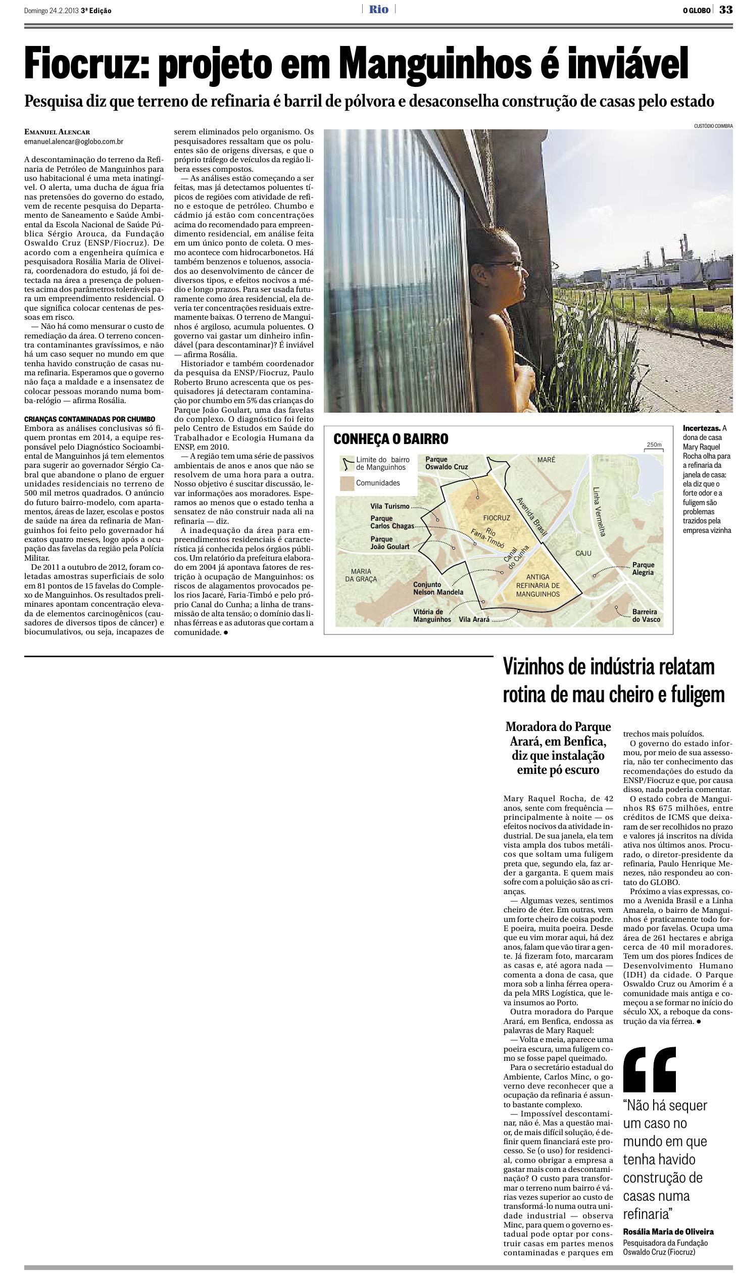 O estudo intitulado Diagnóstico socioambiental de Maguinhos ganhou destaque do jornal O Globo, na edição de domingo (24/2). Coordenado pelos pesquisadores Rosália Maria de Oliveira e Paulo Roberto de Abreu Bruno, ambos do Departamento de Saneamento e Saúde Ambiental (DSSA/ENSP), trata da região em que se localizava a já desativada Refinaria de Petróleo de Manguinhos, cercada pelas comunidades do Complexo de Manguinhos e pelos bairros da Maré, Caju e Benfica. Em seu terreno, o governo do Estado do Rio pretende implantar um projeto habitacional para a população de baixa renda.Rosália declarou ao jornal que "não há como mensurar o custo de remediação da área. O terreno concentra contaminantes gravíssimos, e não há um caso sequer no mundo em que tenha havido construção de casas numa refinaria. Esperamos que o governo não faça a maldade e a insensatez de colocar pessoas morando numa bomba-relógio".
