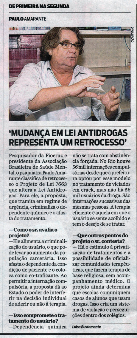O projeto da nova Lei Antidrogas (PL 7663/10), que tramita na Câmara dos Deputados e, entre suas proposições, autoriza o dependente químico a ser internado para tratamento sem que ele ou o juiz autorize – chamada internação compulsória – é um retrocesso para a saúde e a sociedade brasileira. Está é uma das afirmações do pesquisador da ENSP/Fiocruz Paulo Amarante em entrevista para o jornal O Dia de 20 de maio.