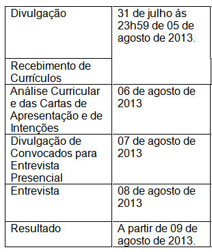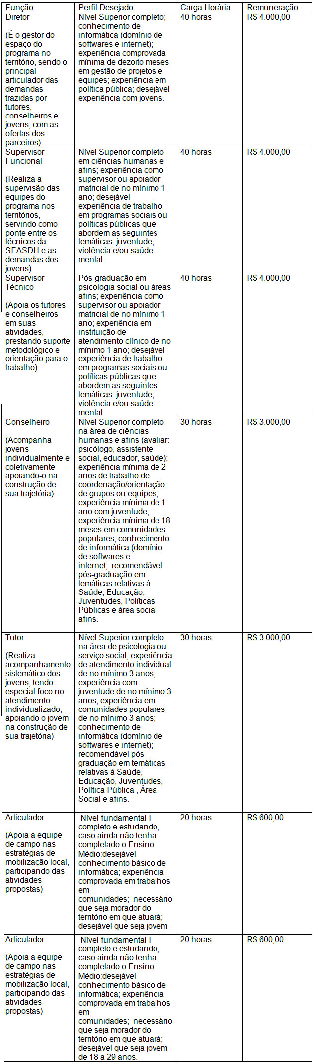 Nos arquivos disponíveis no anexo (lado direito da página), há uma breve descrição das funções a serem exercidas, o perfil desejado, a carga horária de trabalho semanal e a remuneração, além do cronograma de seleção.