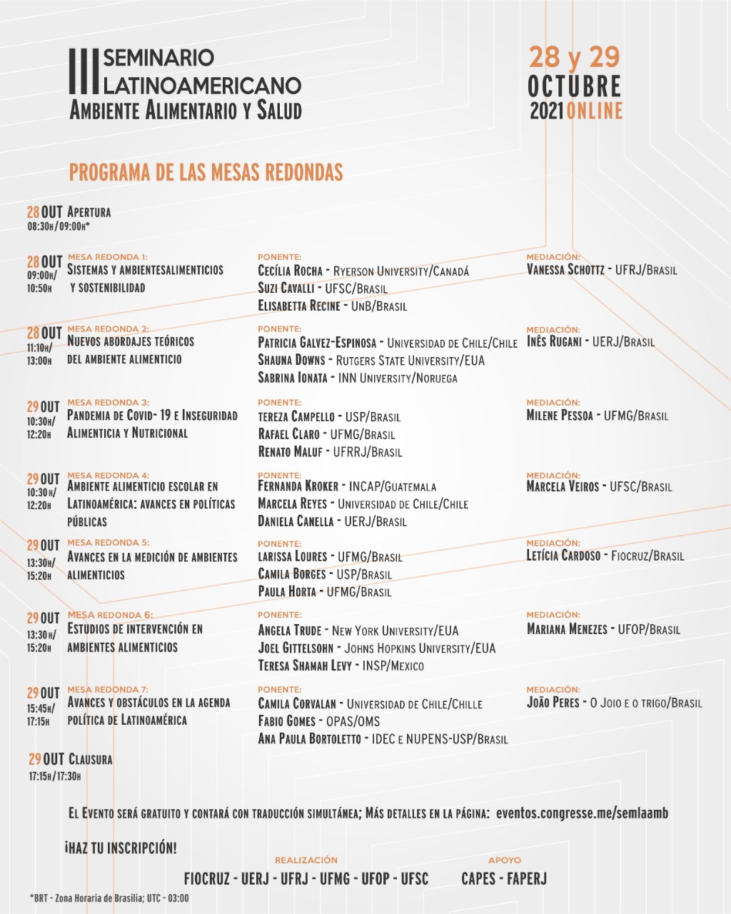 Durante o seminário internacional, a Rede Latino Americana de Saúde Urbana (LAC – Urban Health), através do Projeto SALURBAL – Saúde Urbana na América Latina, e a Fundação Oswaldo Cruz (FIOCRUZ) realizam o evento Diálogos SALURBAL, que ocorrerá no dia 28 de outubro de 2021, de 16:30h às 18h. Este é um evento satélite ao III Seminário Latinoamericano sobre Ambiente Alimentar e Saúde.