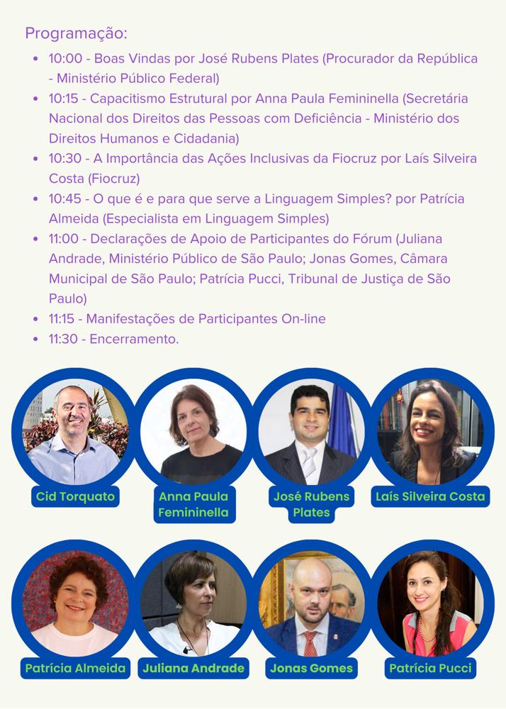 A pesquisadora da ENSP, Lais Silveira Costa, vai participar, no dia 15 de março, da Moção de Apoio à Cartilha 'Combata o Capacitismo' e ao Guia 'Simples Assim', publicações produzidas pela Fiocruz. O evento, organizado pelo Fórum Paulista para Acessibilidade e Inclusão da Pessoa com Deficiência, será realizado on-line, das 10 às 11h30, e contará com o apoio e participação da Secretaria Nacional dos Direitos das Pessoas com Deficiência e da Fiocruz.