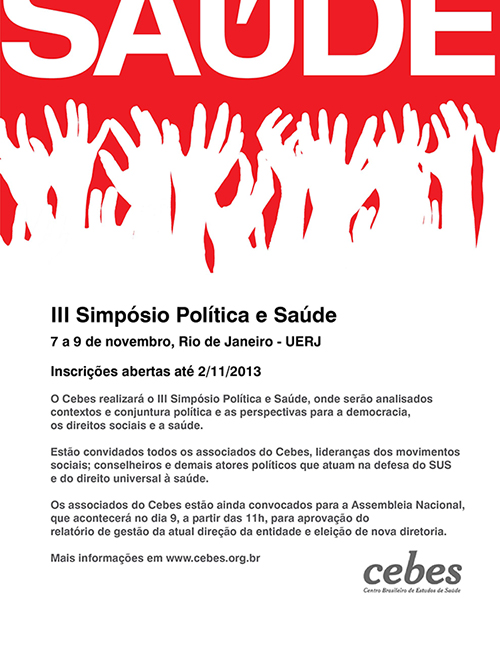 O Centro Brasileiro de Estudos de Saúde (Cebes) vai realizar, de 7 a 9 de novembro, em auditório da UERJ, no Rio de Janeiro, o III Simpósio Política e Saúde, onde serão analisados contextos e conjuntura política e as perspectivas para a democracia, os direitos sociais e a saúde. Além dos integrantes dos núcleos e diretorias, participarão todos os associados do Cebes, lideranças dos movimentos sociais; conselheiros e demais atores políticos que atuam na defesa do SUS e do direito universal à saúde. Os produtos dos debates serão incorporados à nova tese política do Cebes.
